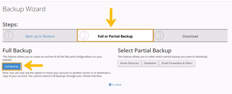 A full cPanel backup includes all account files, databases, email accounts, and settings.