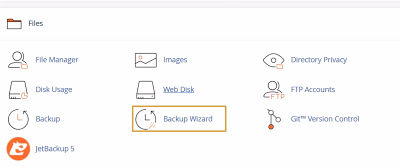 1. Go to cPanel > Files section > Backup Wizard menu:
